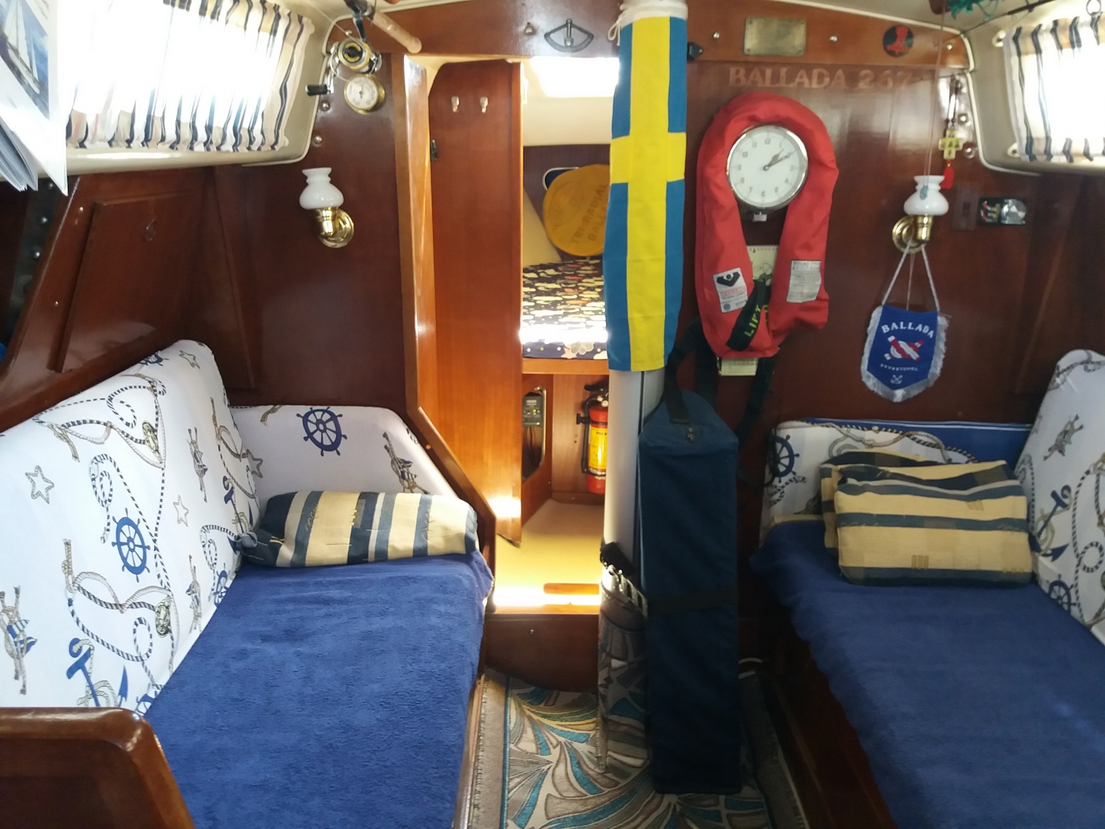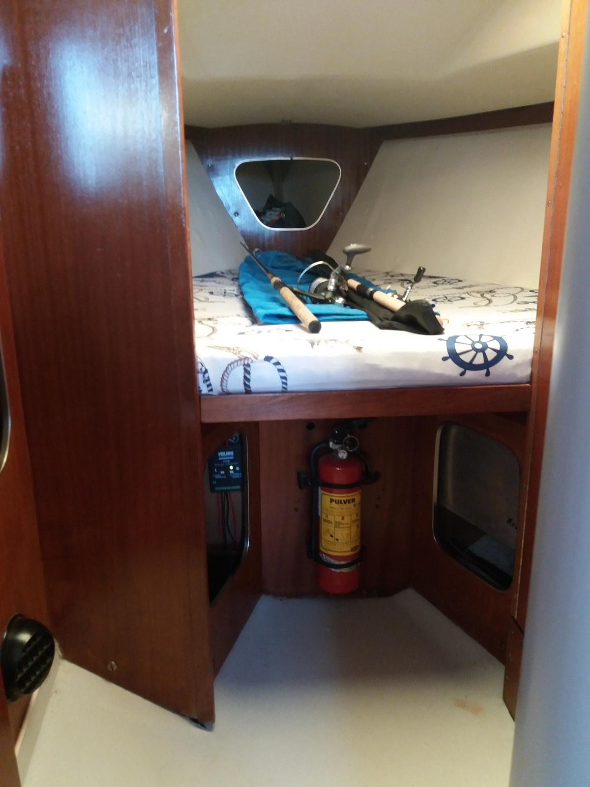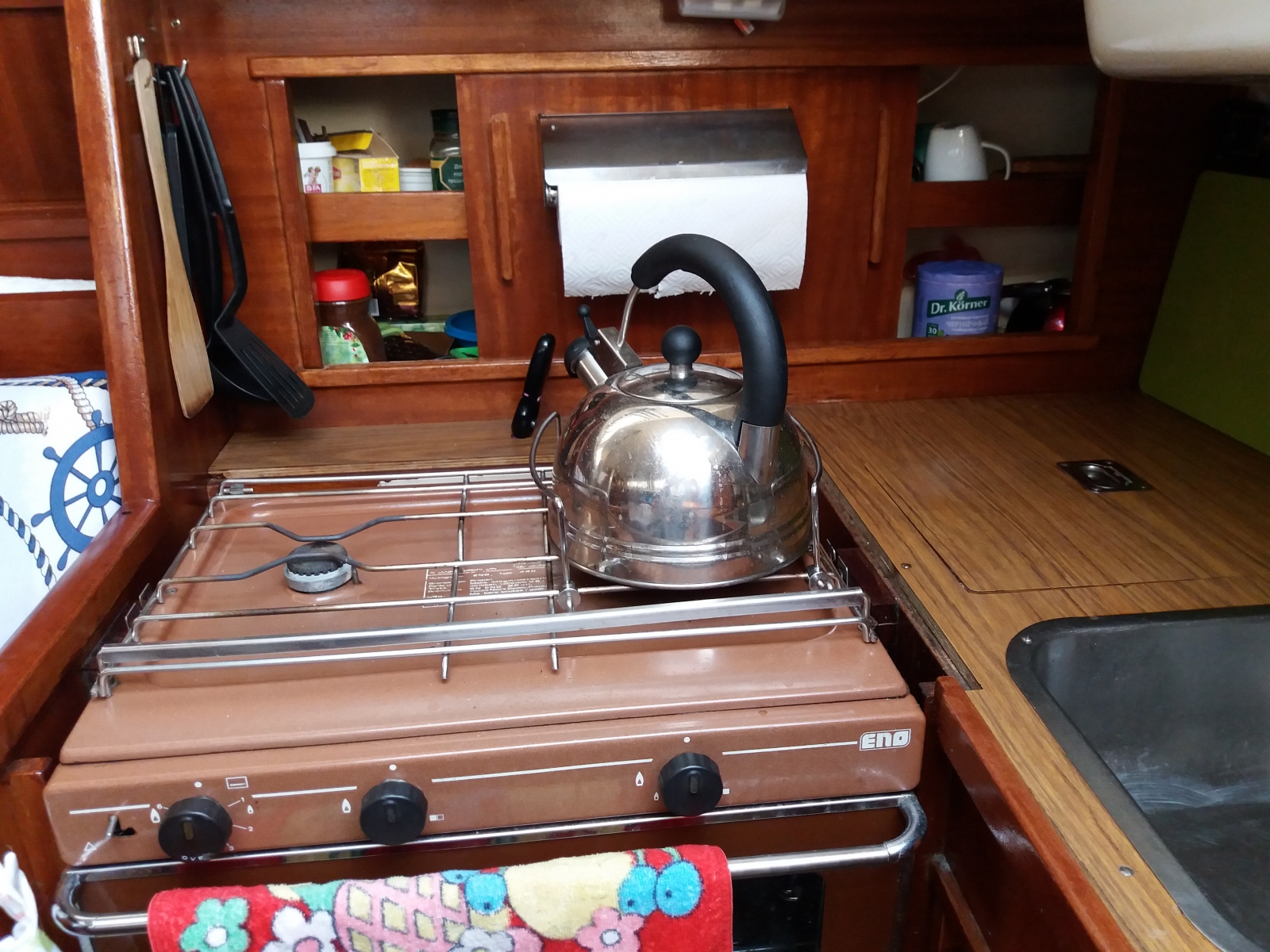 Кухня (камбуз): мойка с пресной и морской водой, газовая 2х-комфорочная плита, холодильник, кухонная и столовая посуда, фужеры.